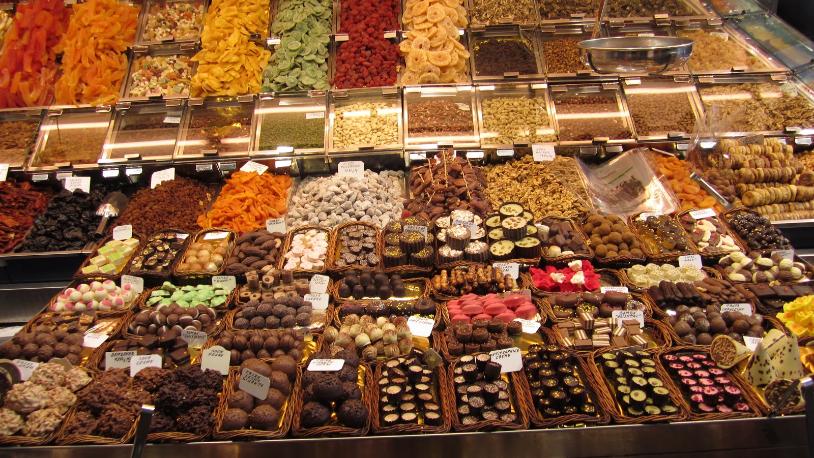 Each stand has spices, candy, meat, juice, produce, and fish piled high.